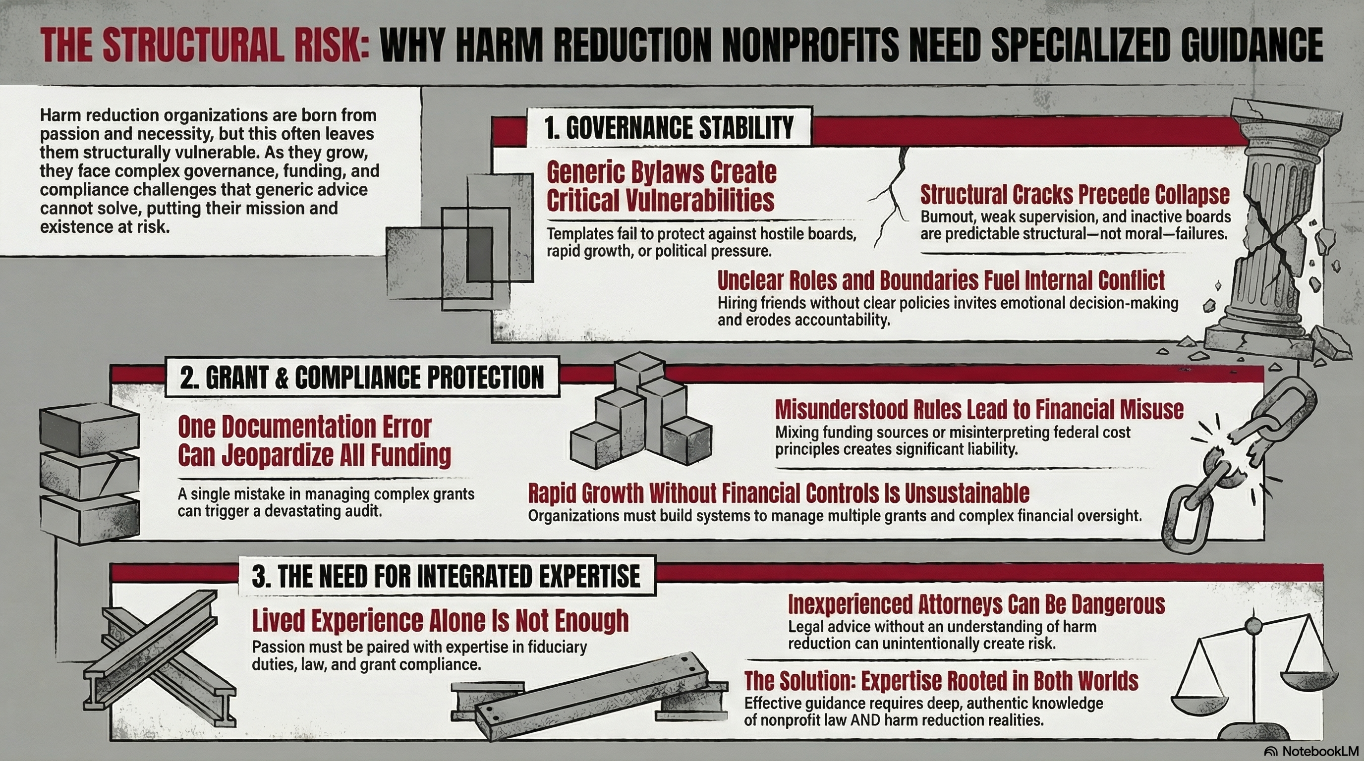 Most attorneys will give you cookie-cutter bylaws and call it a day. We don’t. At Aftermath Strategies, we combine legal training, lived nonprofit experience, and a national reputation in harm reduction to build frameworks that actually work in the real world.